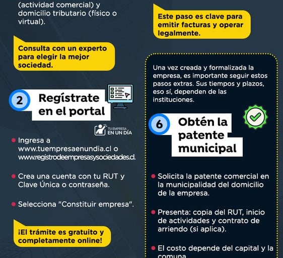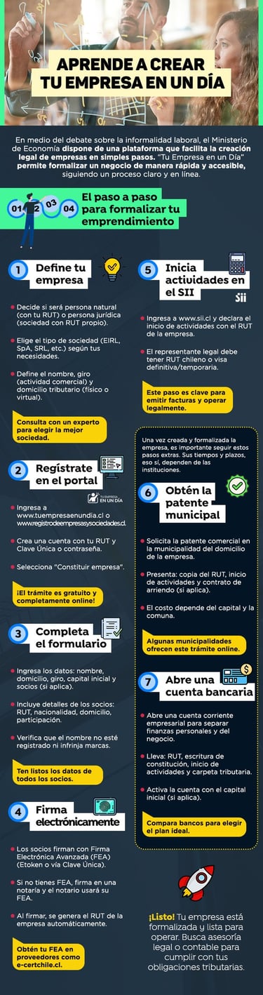 La formalización de empresas representa un paso clave para impulsar la productividad del país, fortalecer el ecosistema económico y brindar mayor seguridad a emprendedores y trabajadores. La informalidad, en cambio, limita el acceso a financiamiento, beneficios sociales y redes de apoyo clave para el crecimiento de los negocios. Un emprendimiento formal tiene mayores posibilidades de contratar personal, acceder a subsidios y créditos, operar legalmente y consolidar una reputación en el mercado. Para facilitar este proceso, el Estado cuenta con herramientas como “Tu Empresa en un Día”, que permite constituir una empresa de forma rápida, simple y completamente en línea. NOTICIA RELACIONADA Vitacura sale a dar explicaciones por "Los Tatas del Pan", otro ejemplo de la burocracia municipal que frena negocios Sin embargo, formalizar no garantiza que los emprendedores estén libres de desafíos. El reciente caso de “Los Tatas del Pan”, panadería liderada por adultos mayores en Vitacura, muestra cómo una empresa ya constituida puede enfrentarse a trabas administrativas municipales. De ahí la importancia, coinciden las agrupaciones gremiales de emprendedores, de promover la formalización acompañada de la simplificación y modernización de los procesos burocráticos que enfrentan las micro, pequeñas y medianas empresas. En la siguiente infografía puedes conocer los pasos para formalizar tu negocio: